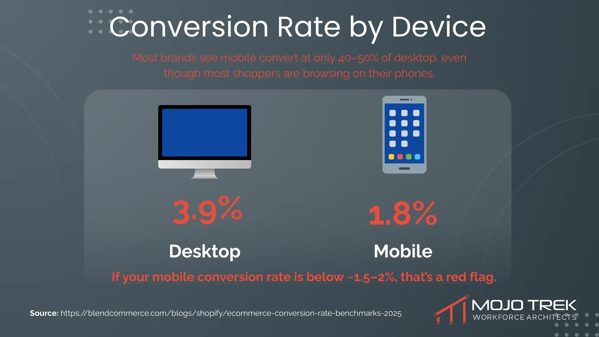 Mobile devices drive the majority of e-commerce traffic, yet they only convert at roughly 1.8% compared to desktops' 3.9%.